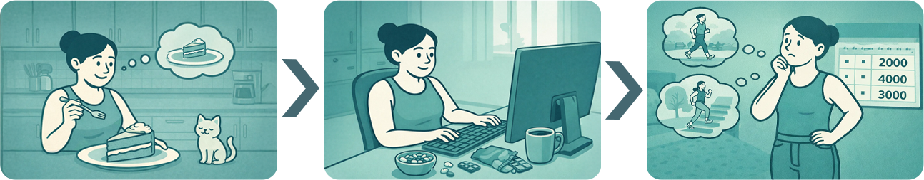 Снова обратимся к исследованиям. Люди с избыточным весом были уверены, что едят меньше 1200 ккал в день, в среднем на деле получали около 2000 ккал - разница была примерно тысяча килокалорий в день. Не потому что они “врали”, а потому что часть еды и перекусов просто не попала в отчёт - она не ощущалась как полноценная еда, а значит, легко вылетала из памяти. Более того, если перекусы или срывы вызывают чувство стыда или дискомфорта, память начинает работать как защита. Это мотивированное избегание информации о прогрессе в достижении цели. Мозг может подсознательно не отслеживать свои действия или «забывать» о них, чтобы избежать неприятных воспоминаний о неудачах.