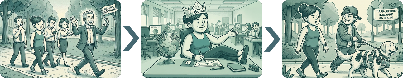 ➤ Базовый период (3 недели до старта): измерение фоновой активности до начала эксперимента. Этот этап позволил ученым зафиксировать естественный уровень подвижности сотрудников – то, сколько они ходят в реальной жизни, пока на них не давят турнирные таблицы и соревновательный азарт.