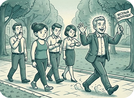 Сегодня первое апреля, надо задумать что-то грандиозное. Рассылаю всем коллегам сообщение: «Стартует корпоративный шаговый челлендж, проходим не меньше 15 000 шагов в день, так 2 недели, потом сравниваем результаты. Андрей Юрьевич, – киваю в сторону директора, – обещал внушительное вознаграждение победителю».