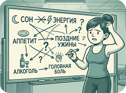 Умному приложению не требуется, чтобы вы были марафонцем или питались исключительно по расписанию. Правильно настроенная нейросеть просто накапливает вашу статистику и подстраивается под ваш ритм жизни. Она анализирует вас относительно ваших же прошлых результатов, чтобы выявлять закономерности, актуальные только для вашего организма, полностью исключая из процесса морализаторство и жесткие рамки ЗОЖ-индустрии.