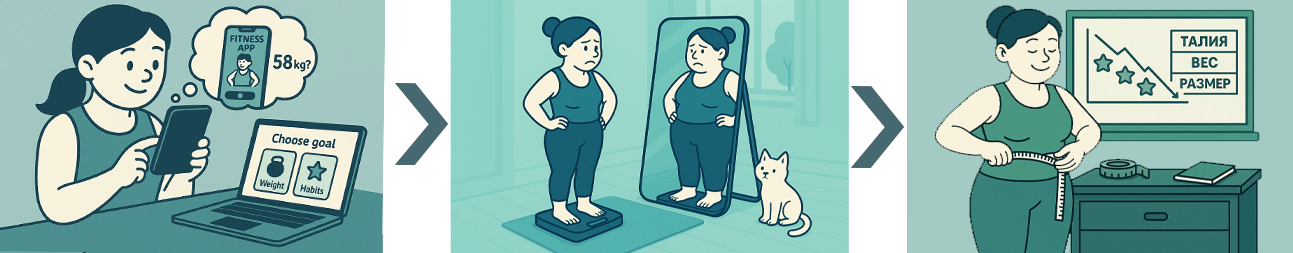 На планёрке у нас случился классический спор. Я говорю: «Почти все фитнес-приложения спрашивают “какой вес хотите достичь?” — это привычно и понятно. Убери этот вопрос из стартовой анкеты — и пользователь решит, что у нас “чего-то не хватает”». Научный руководитель парирует: «Вес — не рычаг, а датчик. Им удобно измерять, но им невозможно управлять. И главное — “желаемый вес” редко равен желаемому виду и самочувствию».